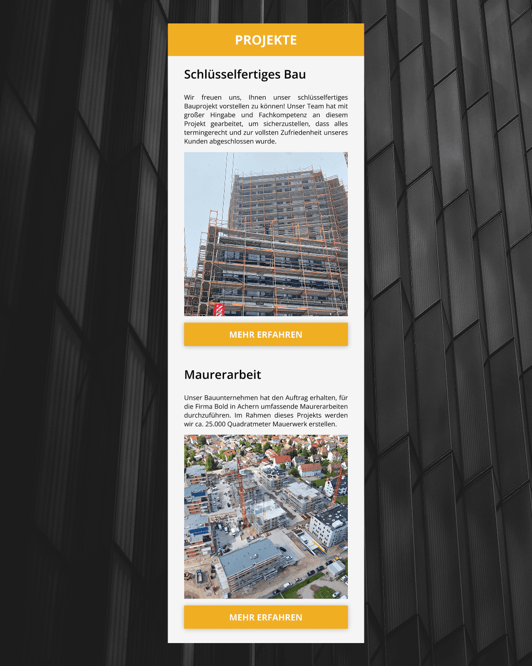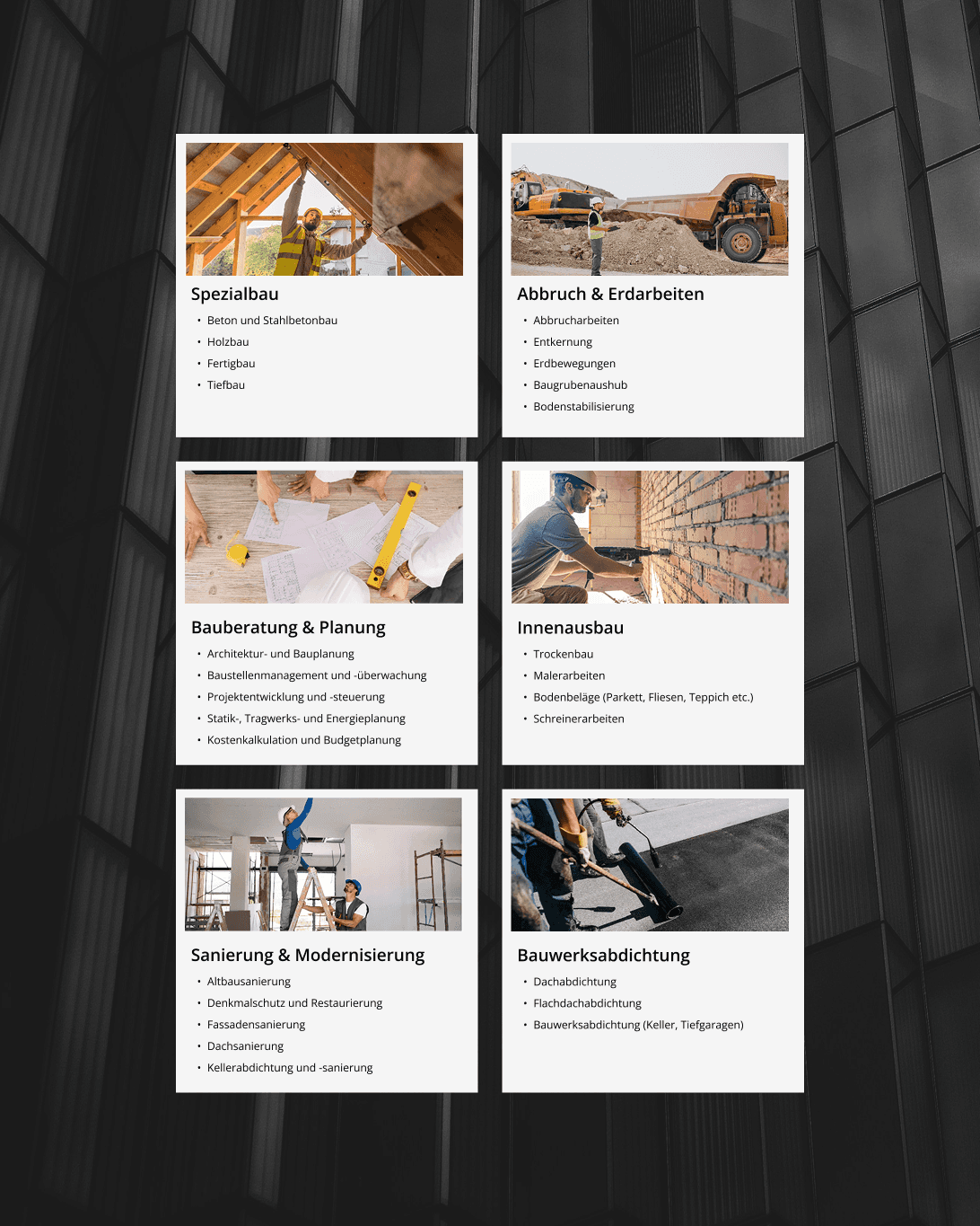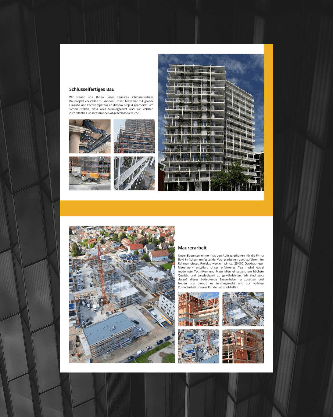 The design follows a strict industrial aesthetic using a striking high-contrast palette, synonymous with the construction sector. Intuitive navigation was established alongside clearly structured sections for services and a project gallery. This allows users to quickly find necessary information and visually verify the quality of the company's workmanship.