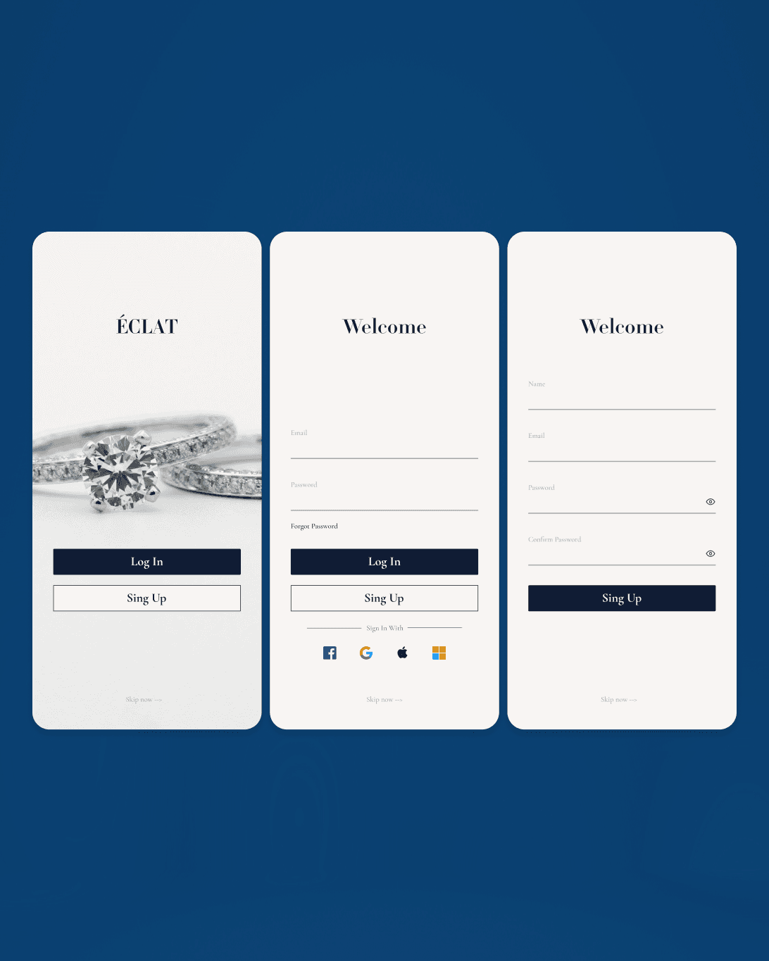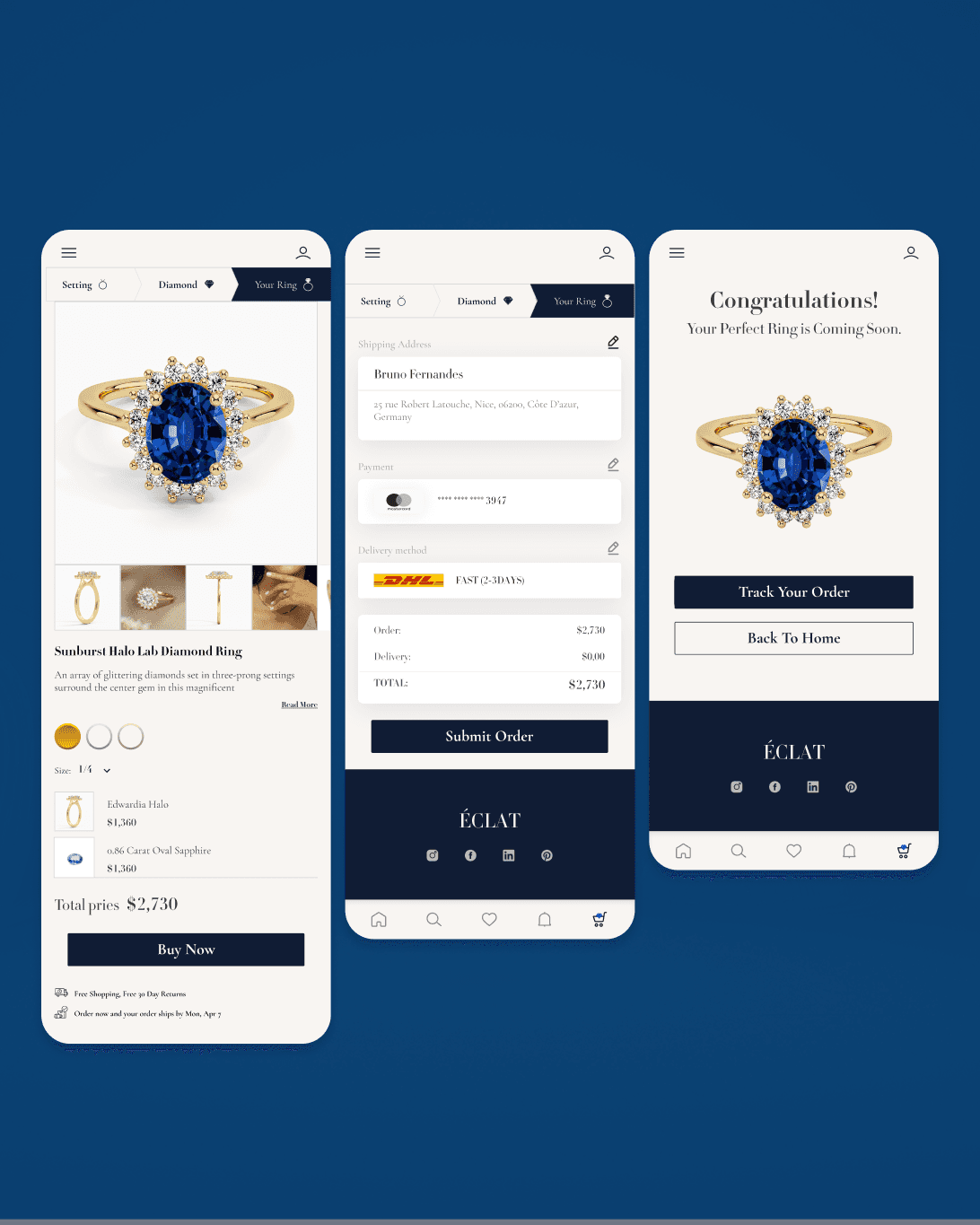 ÉCLAT is a luxury mobile app concept designed to make the process of choosing a diamond ring feel simple, confident, and elegant. The experience focuses on clarity, refined visuals, and intuitive flows that help users explore and customize rings without feeling overwhelmed.
