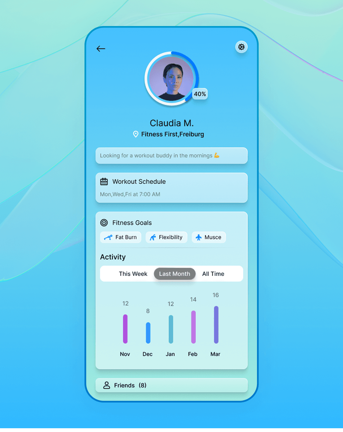 FitM8 is a social fitness mobile app concept designed to connect people through movement, motivation, and shared activity. The app combines fitness tracking with a community-driven experience, allowing users to discover workout partners, explore local fitness spots, and stay engaged through a clean, modern interface.